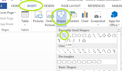 - Untuk membuat garis kita dapat memilih menu Insert, lalu Shapes, kemudian pilih Line. Seperti gambar dibawah ini.